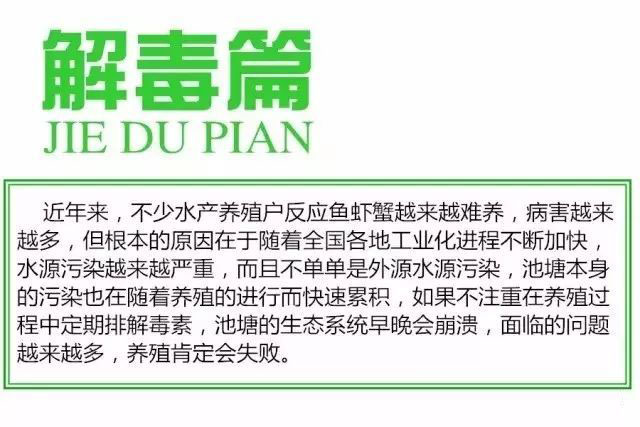 排毒:饲料中添加多维、五黄精华液等中草药制剂,增强肝脏功能,增强肝脏排毒功能;添加乳酸菌等,增强肠胃吸收,减少肠道毒素累积;从而提高鱼虾活力,提高抵抗力。