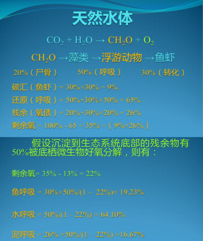 四、氧债动力学 投入到池塘的碳具有双重功能——结构与能量。一部分用于生长,一部分用于能量,无论是鱼虾还是各种其它生物: