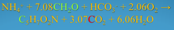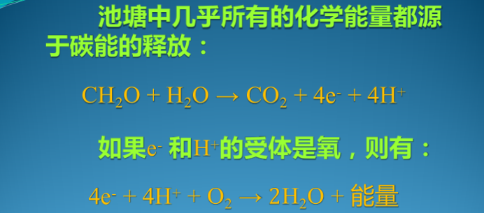 精养池塘由于养殖密度高,需要大量投入饲料,因此,必须配置足够的增氧装置来满足池塘对溶解氧的需求,所以,光合作用输入的溶解氧对于池塘氧的供应来说不是主要来源。氧债的主要源头是饲料中的CH2O,高密度精养池塘很多时候相对于氮而言,碳本身不足,因此,如何充分利用氧债作为能量,提高碳氮平衡度,是精养池塘氧债管理的核心。