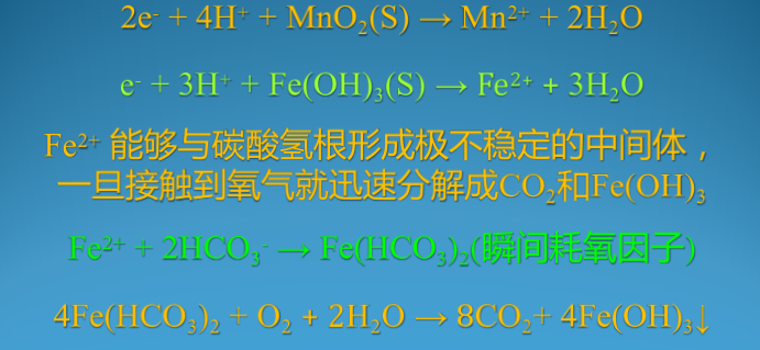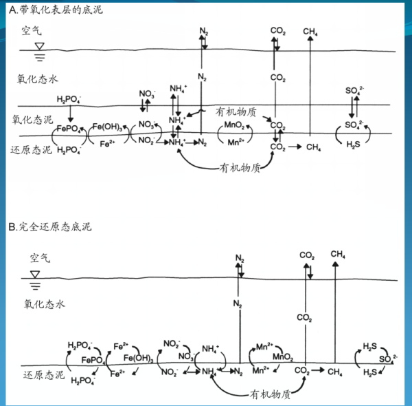 土壤中的氧化物此时也参与作为电子受体和氢受体,所形成的还原性物质则积累于均温层水体中: