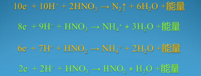 在均温层中,由于水体分层而导致氧无法到达,因此,有氧呼吸很快就结束了。第二个替代氧作为电子受体和氢受体的是氧化态的氮: